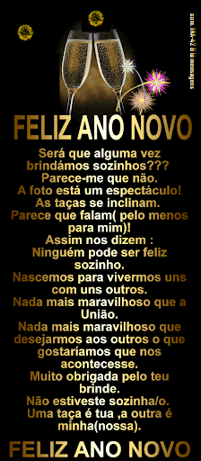 Feliz ano Novo !! Bom hoje quero falar com vc que passou todo esse ano aqui comigo em 2010 no orkut ! primeiramente quero agradeçer a todos de coração pela amizade respeito e carinho que tiveram comigo todo esse ano , meu muito obrigado de coração . E agora vamos entrar no ano 2011 e quero que ele seja muito especial na vida de cada um de vcs com muitas coisas boas : saúde , paz , sucesso e muitos sonhos e desejos sejam Realizados na suas vida . Busque sempre aquilo que está dentro do seu coração com amor e perseverança e não se esqueça de agradeçer Deus, ele sempre está do nosso lado nos ajundando , pois é nosso grande amigo . Vamos ser sempre amigos uns dos outros ajundando quando alguém precisar de nóis fazendo tudo com amor e dedicação sem esperar nada em troca , pois é isso que Deus quer de cada um de nóis que amamos nossa Família , nossos amigos ,aqueles que precisa de um pedaço de pão o quer for etc ... Isso sim simboliza o Verdadeiro ano novo em nossa vida . Então vamos nessa unidos escrever a nossa história nesse ano de 2011 conto com vc ok ...